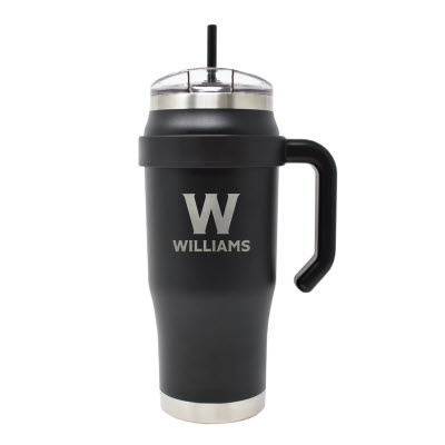 Stainless steel 32 oz. travel mug with laser etched Williams College Ephs. Purple.