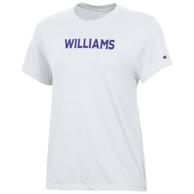 Champion® women's t-shirt with purple Williams on the front. White.