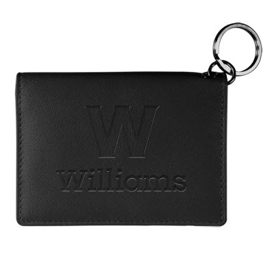 Leather ID holder with keychain, 2 inside pouches and embossed Williams College. Black