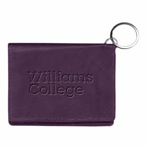 Leather ID holder with keychain, 2 inside pouches and embossed Williams College. Purple