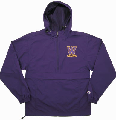 Mens Pack'n'Go 1/2 zip jacket shell from Champion with front zippered self-storage pocket, front muff pocket, adjustable elastic cords at the hood & waist and W & Williams on the left chest. Purple. 100% polyester.