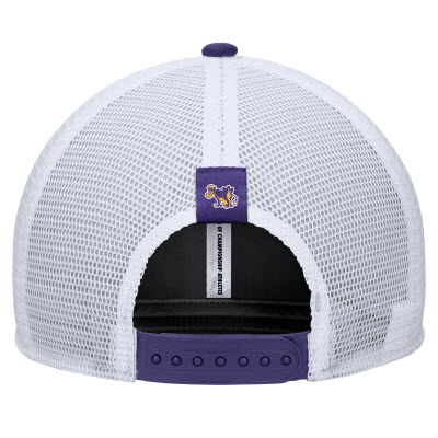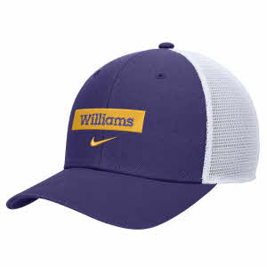 Nike® Dri-Fit Rise Trucker Hat with purple Williams inside gold bar and Nike swoosh embroidered on the front. Mesh back with cow patch. One size fits most. Purple.