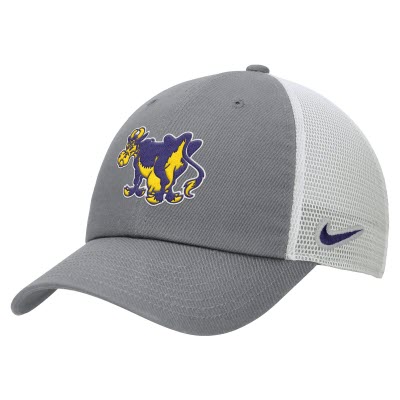 Nike® Club Trucker Hat with purple and gold cow on the front, and the Nike® swoosh embroidered on the side. Grey.