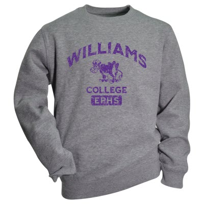 Youth crewneck sweatshirt with arch Williams over the cow and College Ephs on the front. Oxford Sizes 2T - YXL.