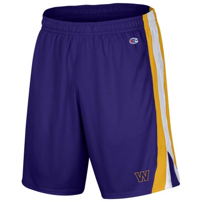 Lightweight, breathable Stadium shorts from Champion with 2 side pockets, elastic waistband, and W on the left leg. 8.5" inseam. Purple.