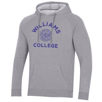 Champion® Triumph Fleece hooded sweatshirt with an arch Williams over Seal and College on the front chest. Gray.