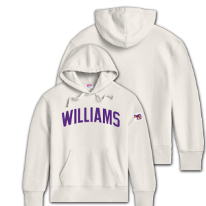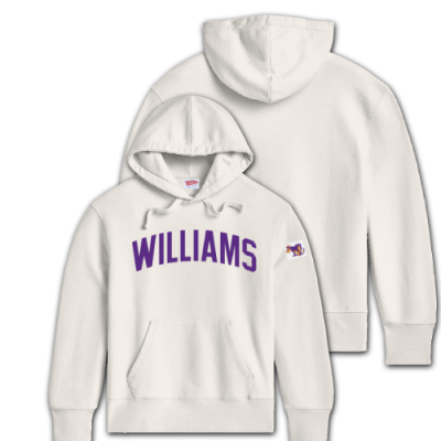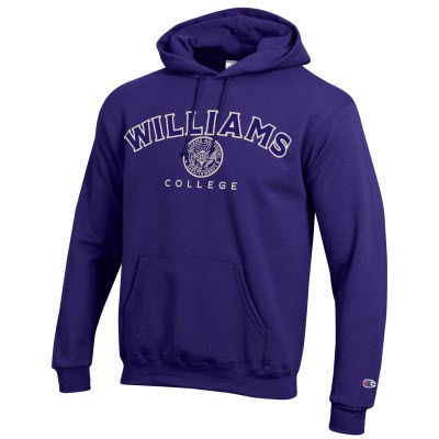 Champion® hooded sweatshirt with an appliqué Williams and Williams College Seal on the front chest. Purple.